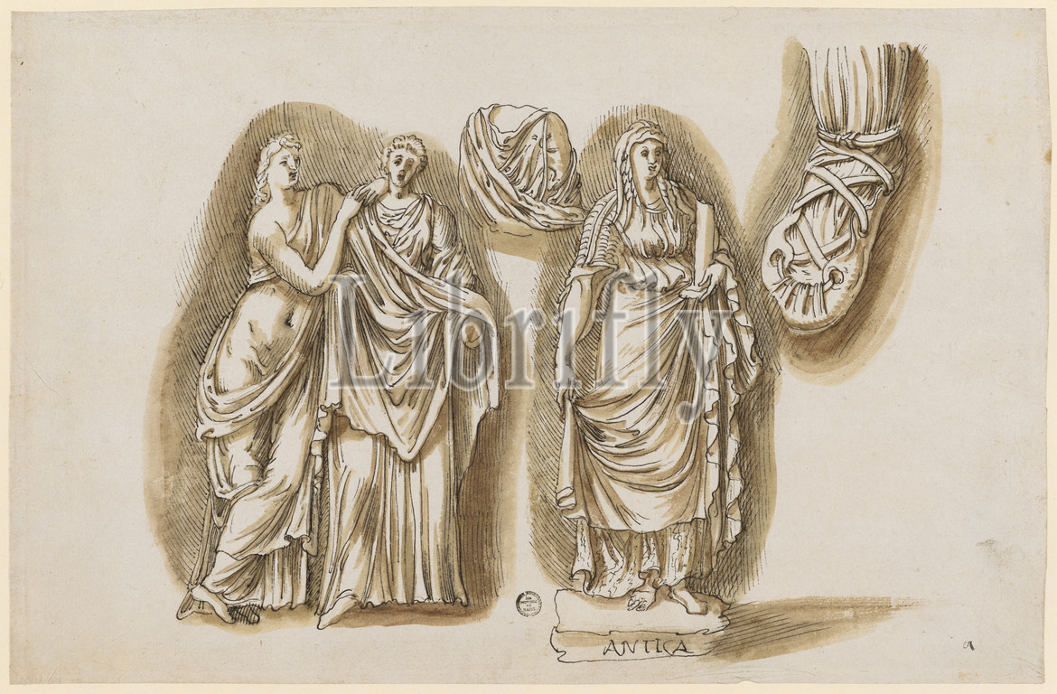Demeter and Kore from the relief of the Puteal Albani, female upper body, archaic female statue holding a column, Bundschuh einer Barbarien, 1541/47, feather in brown, maroon, sheet: 19.9 x 30.5 cm, inscribed on the pedestal of the statue: ANTICA, u, ., r., numbered: 5, Frans Floris de Vriendt I., (Kopie nach / copy after), Antwerpen 1519/20–1570 Antwerpen