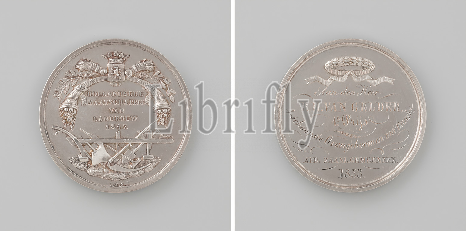 Department, Zaanland municipalities, Hollandsche Maatschappij van Landbouw, medal awarded first prize, P.H, van Gelder, four, beautiful fruit-bearing orange trees, black-and-white Medal, Front, crowned coat, arms lying, two grain sheaves, two inverted, filled horns, abundance, oak, willow branch, inscription, agricultural implements, Reverse, wreath, olive branches, ribbon, inscriptions, Holland, Zaandam, Pieter Hendrik van Gelder, Johannes Petrus Schouberg, Utrecht, 1853, black-and-white, metal, engraving