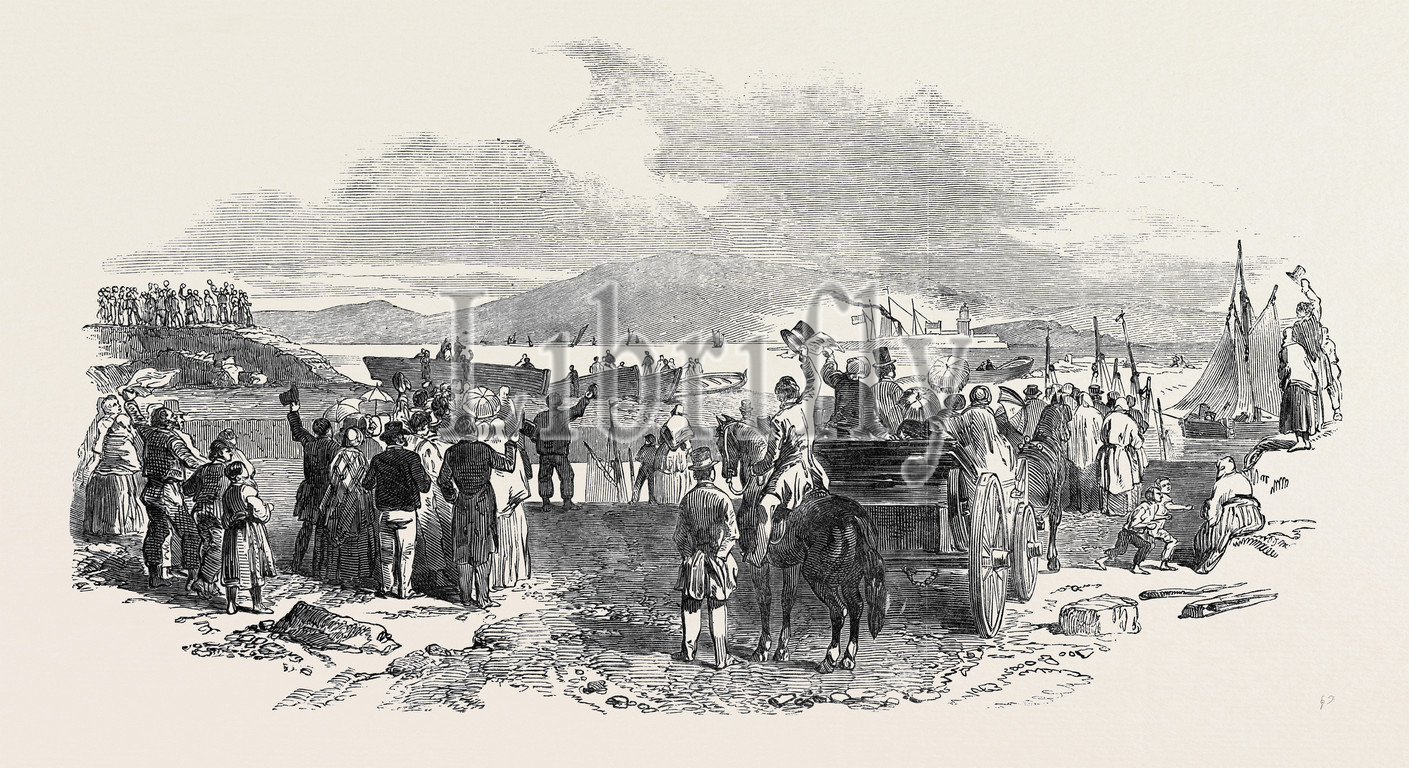 departure, viceroy, steamer, dock, quay, galway, 1850 engraving, engraved image, history, illustrative technique, engravement, victorian, arts, culture, retro styled, vintage, retro, arkheia