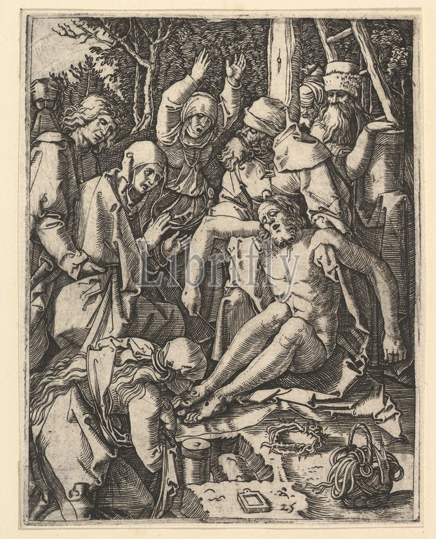 The Deposition; Christ being taken from the Cross, a man on a ladder is holding the body while St John is supporting the weight with a cloth rope, after Dürer, ca. 1500–1534, Engraving; second state of three, Sheet: 5 1/16 × 3 15/16 in. (12.9 × 10 cm), Prints, Marcantonio Raimondi (Italian, Argini (?) ca. 1480–before 1534 Bologna (?)), After Albrecht Dürer (German, Nuremberg 1471–1528 Nuremberg), Deposition scene from 'The Passion of Christ' after Albrecht Dürer's 'Little Passion'