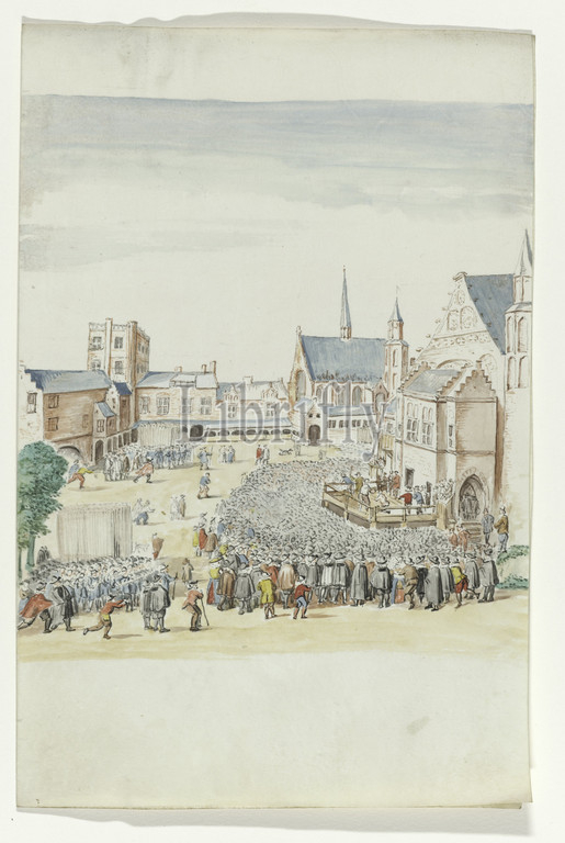 The Deposition of Van Oldenbarnevelt Regtspleging of Oldenbarnevelt (series title), Watercolor on which the crowd gathered in the Binnenhof for the depiction of Van Oldenbarnevelt. Associated with series of watercolors in book, Johan van Oldenbarnevelt, anonymous, Netherlands, 1708 - 1795, parchment (animal material), watercolor (paint), ink, pen, h 23.5 cm × w 19 cm