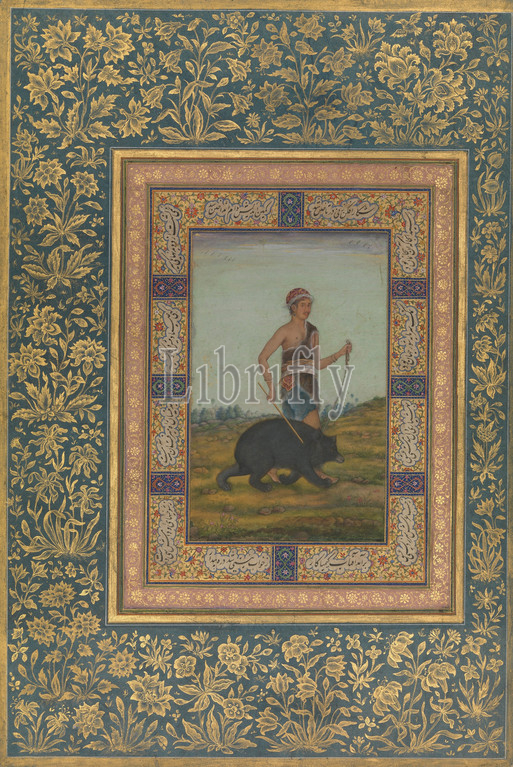 Dervish Leading, Bear, Folio, Shah Jahan Album, recto, early 19th century, verso, later copy, 16th century original, Attributed, India, Ink, opaque watercolor, gold, paper, H, 15 3/16, 38.6 cm, Codices