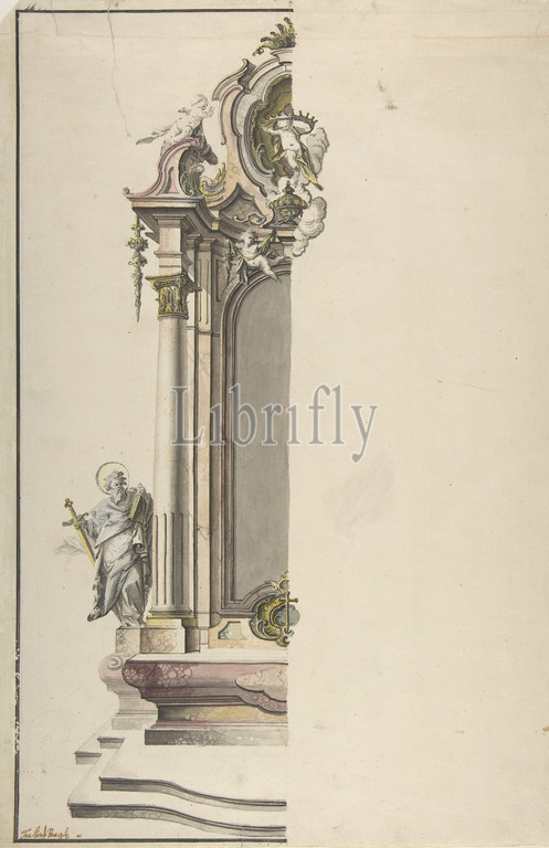Design, Aedicular Altar, St, Paul, Left, mid-18th century, Graphite, gray wash, watercolor, white gouache, Broad framing line, pen, black ink, sheet, 18 1/4 x 12 1/4, 46.4 31.1 cm, Drawings, Johann Georg Dirr, German, Weilheim, 1723–1779, Mimmenhausen