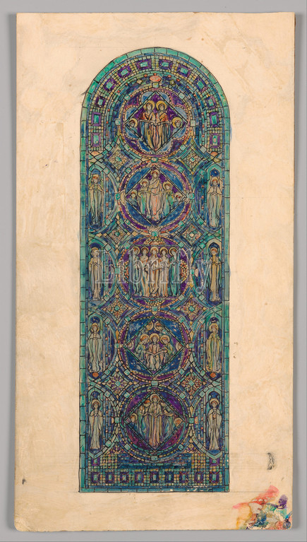 Design for 'Angels of Praise' window, late 19th–early 20th century, Made in New York, United States, American, Watercolor, gouache, and ink on paper mounted on board in original matt, Overall: 21 5/8 x 11 1/16 in. (54.9 x 28.1 cm), Drawings, Possibly Tiffany Glass Company (1885–92), Possibly Tiffany Glass and Decorating Company (American, 1892–1902)