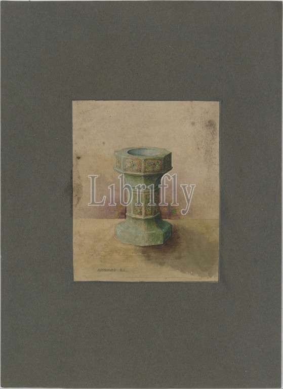 Design, baptismal font, late 19th–early 20th century, New York, United States, American, Watercolor, graphite, paper mounted, board, Overall, 16 7/8 x 12 1/4, 42.9 31.1 cm, Drawings, possibly, Tiffany Glass Company, 1885–92, and Decorating, 1892–1902, Studios, 1902–32