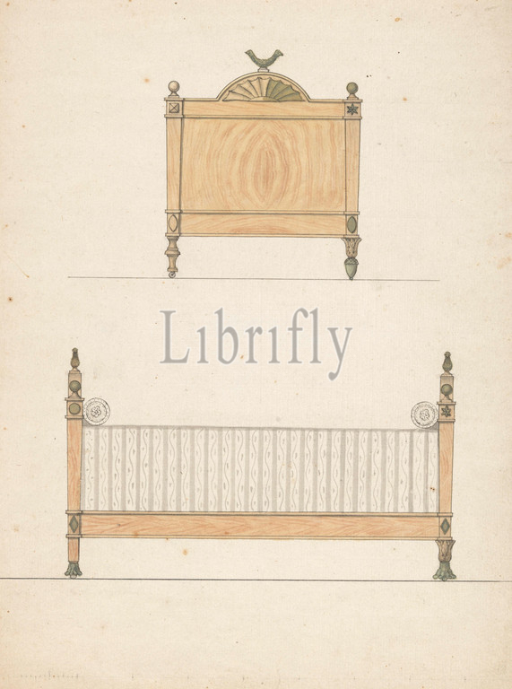 Design, bedstead, front, side view, bird-crowned bedstead, four alternative leg solutions, Bed, Paris, c, 1790, paper, watercolor, paint, graphite, mineral, pen