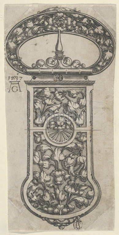 Design for a Buckle with Tendrils, 1537, Engraving; first state of two (Hollstein), Sheet: 5 3/4 × 2 11/16 in. (14.6 × 6.9 cm), Heinrich Aldegrever (German, Paderborn ca. 1502–1555/1561 Soest), Design for a belt buckle with cherub in medallion at center. Leaf ornaments on plate and loop.