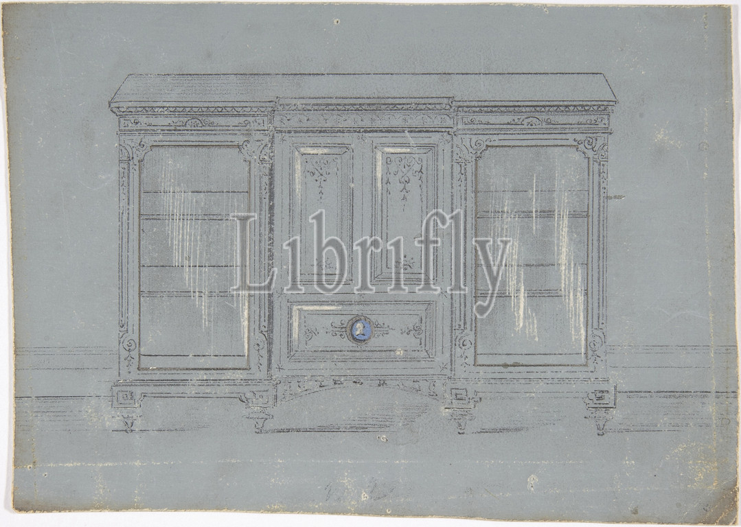 Design, Cabinet, Glass Side Doors, Porcelain Plaque, 19th century, Graphite, watercolor, scratching, grey ground, sheet, 5 1/4 x 7 3/8, 13.4 18.8 cm, Anonymous, British