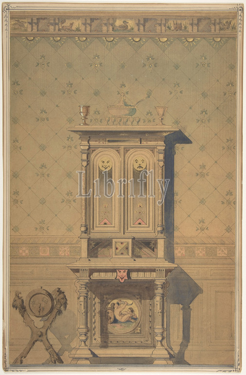Design, Cabinet, Interior Setting, 1870–80, Graphite, watercolor, gray wash, metallic paint, thin tracing paper mounted, cardboard, decorative framing lines, pencil, Image, 13 7/8 x 8 7/8, 35.2 22.6 cm, Drawings, Anonymous, German, 19th century