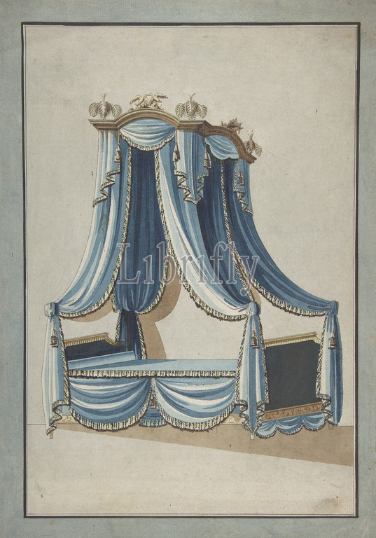 Design, Canopy Bed, ca, 1760–80, Watercolor, graphite, Sheet, 12 3/4, 8 5/8, 32.4, 21.9 cm, Anonymous, French, 18th century, canopy, bed, played, essential role, every nobleman, bedroom, afford privacy, northern parts, Europe, rich draperies, important part, keeping, temperature agreeable