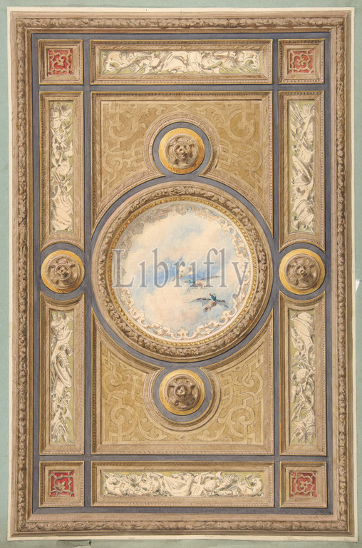 Design for a carved and painted ceiling with clouds and ducks in the central circular panel, 1830–97, graphite, pen and ink, watercolor on wove paper; mounted on blue paper, Overall: 20 1/4 x 13 3/8 in. (51.5 x 33.9 cm), Drawings, Jules-Edmond-Charles Lachaise (French, died 1897), Eugène-Pierre Gourdet (French, born Paris, 1820)