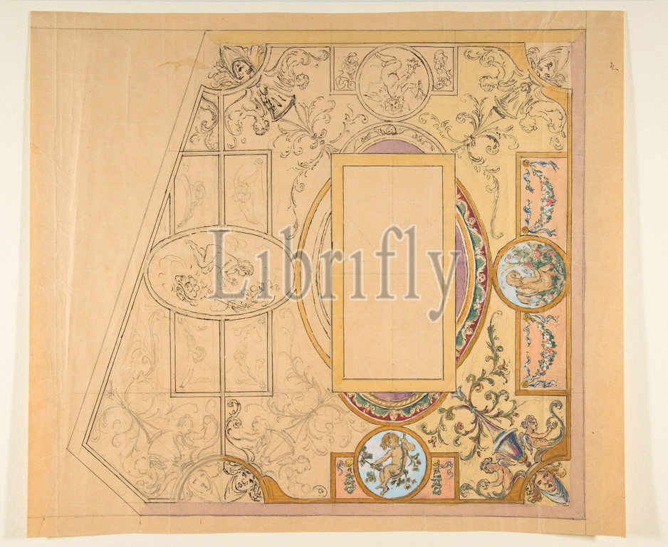 Design, ceiling decoration, 19th century, Graphite, pen, ink, watercolor, gouache, peach wove paper, sheet, 16 1/4 x 14 1/4, 41.3 36.2 cm, Drawings, Anonymous, French