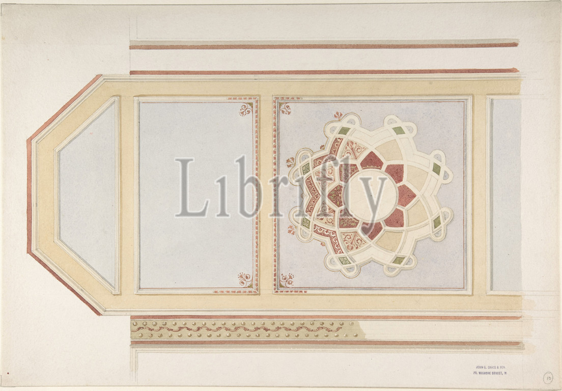 Design, Ceiling, Four Parts, Decorated, Compass Motif, Rust, Olive Green, Moorish Motifs, 19th century, Graphite, watercolor, reds yellows, blues, gilt, sheet, 16 7/8 x 11 5/8, 42.9 29.5 cm, John Gregory Crace, British, London, 1809–1889, Dulwich, and Son, Dibblee, 1838–1919