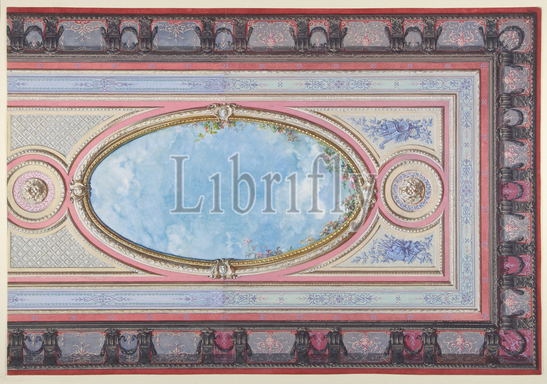 Design, Ceiling, Gallery, Château de Magnitot, recto, Decorative Design, verso, second half 19th century, Watercolor, gouache, gilt, 19 7/16 x 13 3/8, 49.3 34 cm, Drawings, Jules-Edmond-Charles Lachaise, French, died, 1897, Eugène-Pierre Gourdet, born Paris, 1820