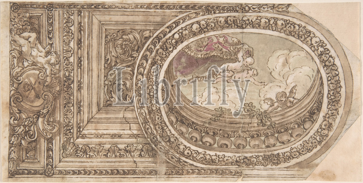 Design, Ceiling, Oval Trompe L'Oeil Painting, 17th century, Pen, brown ink, brush, wash, watercolor, traces, graphite underdrawing, ruled construction, sheet, 7 13/16 x 3 15/16, 19.8 10 cm, Anonymous, Italian