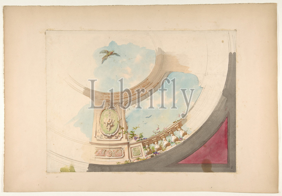 Design, ceiling, trompe l'oeil balustrade, sky, second half 19th century, Graphite, gouache, watercolor, Overall, 13 3/8 x 19 5/8, 33.9 49.9 cm, Drawings, Jules-Edmond-Charles Lachaise, French, died, 1897, Eugène-Pierre Gourdet, born Paris, 1820