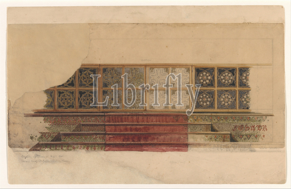 Design, chancel rail, late 19th–early 20th century, New York, United States, American, Watercolor, metallic ink, graphite, tracing paper, buff paper board, Overall, 9 1/2 x 14 3/4, 24.1 37.5 cm, Drawings, possibly, Tiffany Glass Company, 1885–92, and Decorating, 1892–1902, Studios, 1902–32