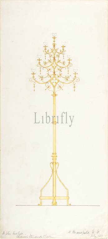 Design for Church Lamp Stand, 1889, Pen and brown ink, watercolor over graphite with touches of white gouache, sheet: 16 x 7 3/16 in. (40.7 x 18.3 cm), B. Mansfield (British, active 1880s)