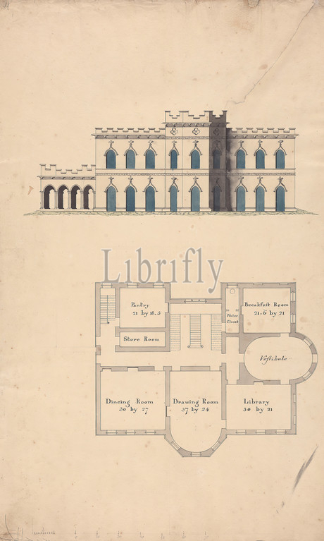 Design, Clifton Castle, Yorkshire, Plan, Elevation, Gothic Style, ca, 1780-1790, Graphite, pen, black ink, watercolor, smooth, moderately thick, cream wove paper, Sheet, architectural subject