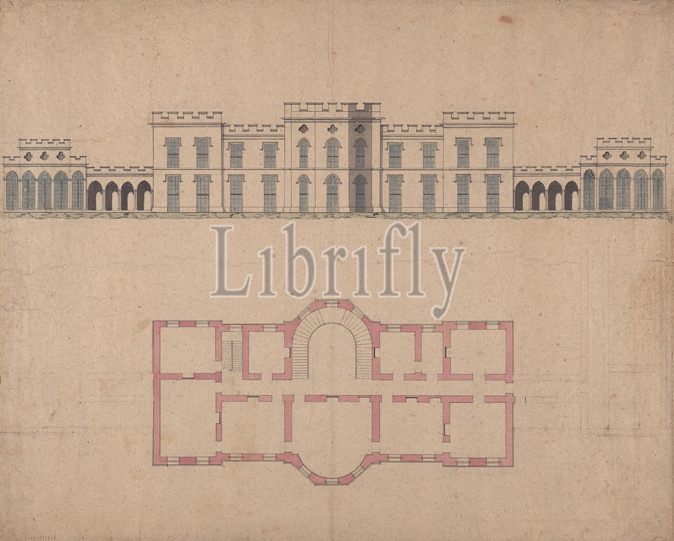 Design, Clifton Castle, Yorkshire, Plan, Elevation, Romanesque Style, ca, 1780-1790, Pen, black ink, watercolor, graphite, rough, moderately thick, beige wove paper, Sheet, architectural subject