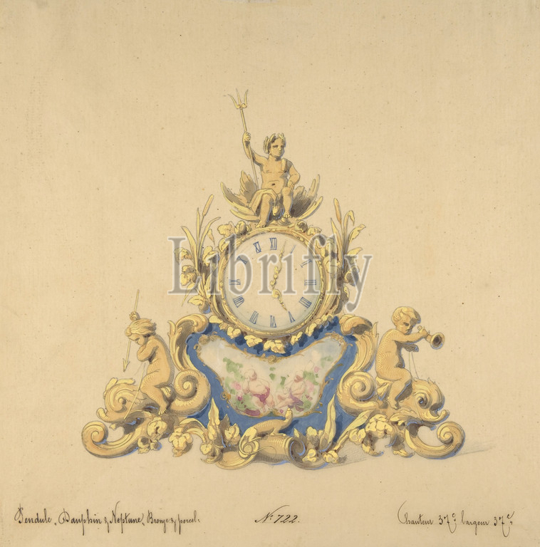 Design, Clock, Neptune, 19th century, Graphite, watercolor, gouache, gold gilt, sheet, 10 11/16 x 10 5/8, 27.2 27 cm, Drawings, Anonymous, French
