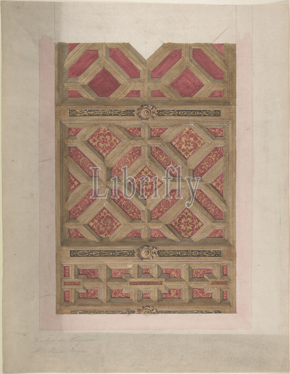 Design, Coffered Ceiling, Red, Gold, second half 19th century, Pen, black ink, watercolor, gilt, 17 1/8 x 13 1/4, 43.5 33.7 cm, Drawings, Jules-Edmond-Charles Lachaise, French, died, 1897, Eugène-Pierre Gourdet, born Paris, 1820