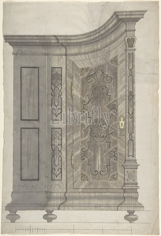 Design, Concave Corner Cabinet, Part, Larger Wall-Covering Unit, ca, 1730–40, Pen, black ink, brush, gray, brown wash, watercolor, traces, ruled graphite lines, sheet, 14 1/8 x 9 5/8, 35.8 24.5 cm, Anonymous, German, 18th century, first sight, design, cabinet, somewhat strange, second view tells, us, ’re looking, flattened, perspectival, view, concave corner, shaped example, secret library, Benedictine monastery, Ottobeuren, Schwaben, Germany, part, larger wall, unit, dated, 1730