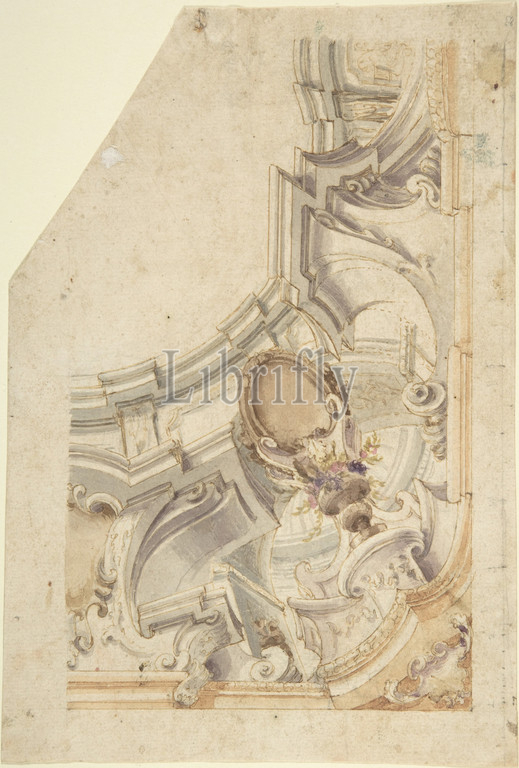 Design, Corner, Cove, 1700–1780, Pen, light brown ink, brush, gray, wash, watercolor, lead point, ruled, compass construction, 10 x 6 3/4, 25.4 17.2 cm, cropped, left corner, Drawings, Anonymous, Italian, Piedmontese, 18th century