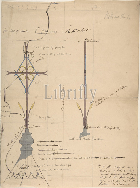 Design, Cross Supported, Lead Roof Cap, Belleaw Church, 1, ca, 1880, Pen, ink, wash, watercolor, sheet, 15 1/4 x 11 1/8, 38.8 28.3 cm, Attributed to Richardson Ellson & Co., British