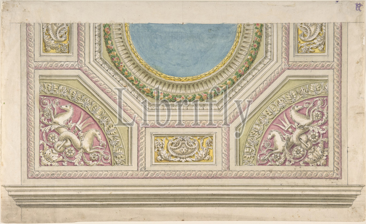 Design, Decorated Ceiling, 19th century, Pen, watercolor, 9-3/8 x 15-1/4, Anonymous, Italian