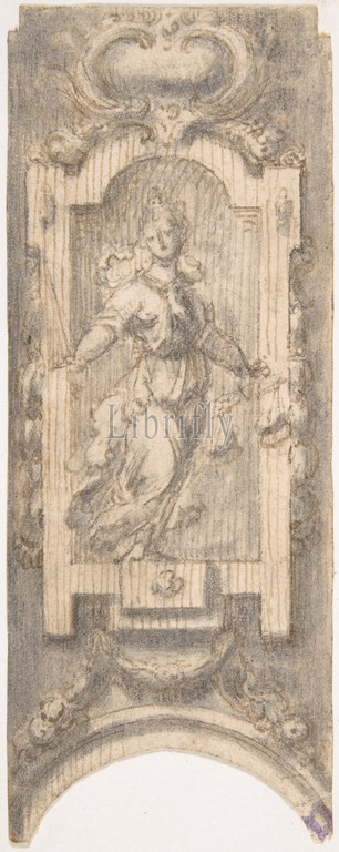 Design, Decoration, Arch, Personification, Justice, 1680–1730, Pen, brown ink, brush, gray, wash, black chalk, 5 5/16 x 2 1/16, 13.5 5.2 cm, maximum, drawing partially silhouetted., Anonymous, Italian