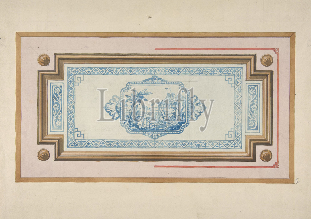 Design, decoration, ceiling, Chinese blue, white design, 1830–97, pen, ink, watercolor, wove paper, Overall, 10 9/16 x 14 7/8, 26.9 37.8 cm, Drawings, Jules-Edmond-Charles Lachaise, French, died, 1897, Eugène-Pierre Gourdet, born Paris, 1820