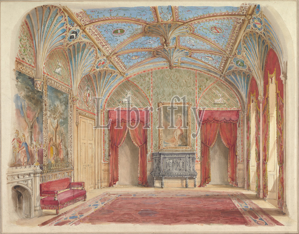 Design, Decoration, Drawing Room, Eastnor Castle, Hertfordshire, 19th century, Watercolor, touches, gold, graphite, off-white wove paper, sheet, 15 3/8 x 19 13/16, 39.1 50.4 cm, John Gregory Crace, British, London, 1809–1889, Dulwich, and Son