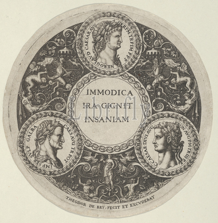 Design for a Dish with Portraits of the Roman Emperors Nero, Galba, and Caligula, ca. 1588, Engraving, Sheet: 5 × 5 in. (12.7 × 12.7 cm), Theodor de Bry (Netherlandish, Liège 1528–1598 Frankfurt), Design for a dish with medallions containing the portraits of three Roman Emperors – Nero (top), Galba (left), and Caligula(right) – around a central medallion with the title. To the left and right of the central medallion, scenes with grotesques, including two armored figures jousting towards each other at center