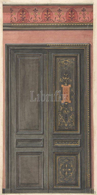 Design, door, second half 19th century, Graphite, watercolor, white heightening, Overall, 26 3/4 x 13 11/16, 67.9 34.7 cm, Drawings, Jules-Edmond-Charles Lachaise, French, died, 1897, Eugène-Pierre Gourdet, born Paris, 1820