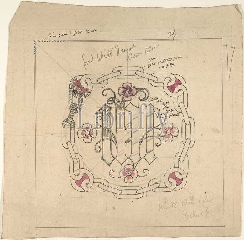 Design for Ecclesiastical Embroidery -- Veil and Bun, late 19th–early 20th century, Watercolor, pen and black ink over graphite, sheet: 9 3/4 x 9 3/4 in. (24.8 x 24.8 cm), Ernest Geldart (British, London 1848–1929)