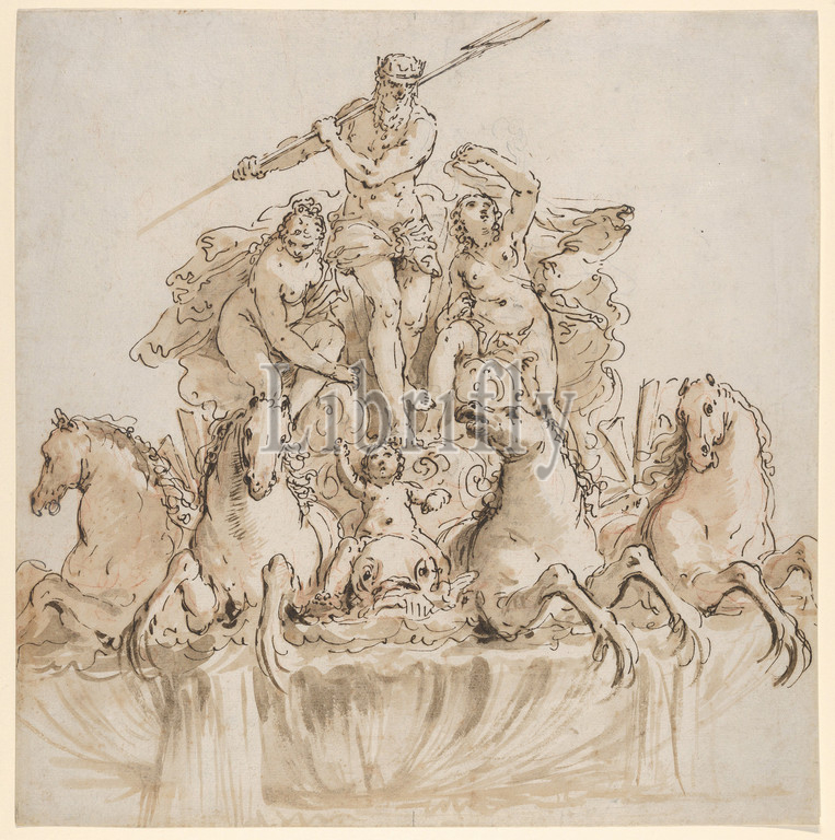 Design for a Fountain with Neptune in his Chariot, ca. 1740–60, Black and red chalk, pen and brown ink, brown wash, Sheet: 10 11/16 × 10 9/16 in. (27.1 × 26.8 cm), Francesco Fontebasso (Italian, Venice 1707–1769 Venice), Design for a fountain with the figure of Neptune in his chariot. The outline of the fountain describes a pyramid with Neptune on his shell-shaped chariot in the center at the top, flanked by two seated nymphs and four hippocampi at the bottom of the design drawing the chariot