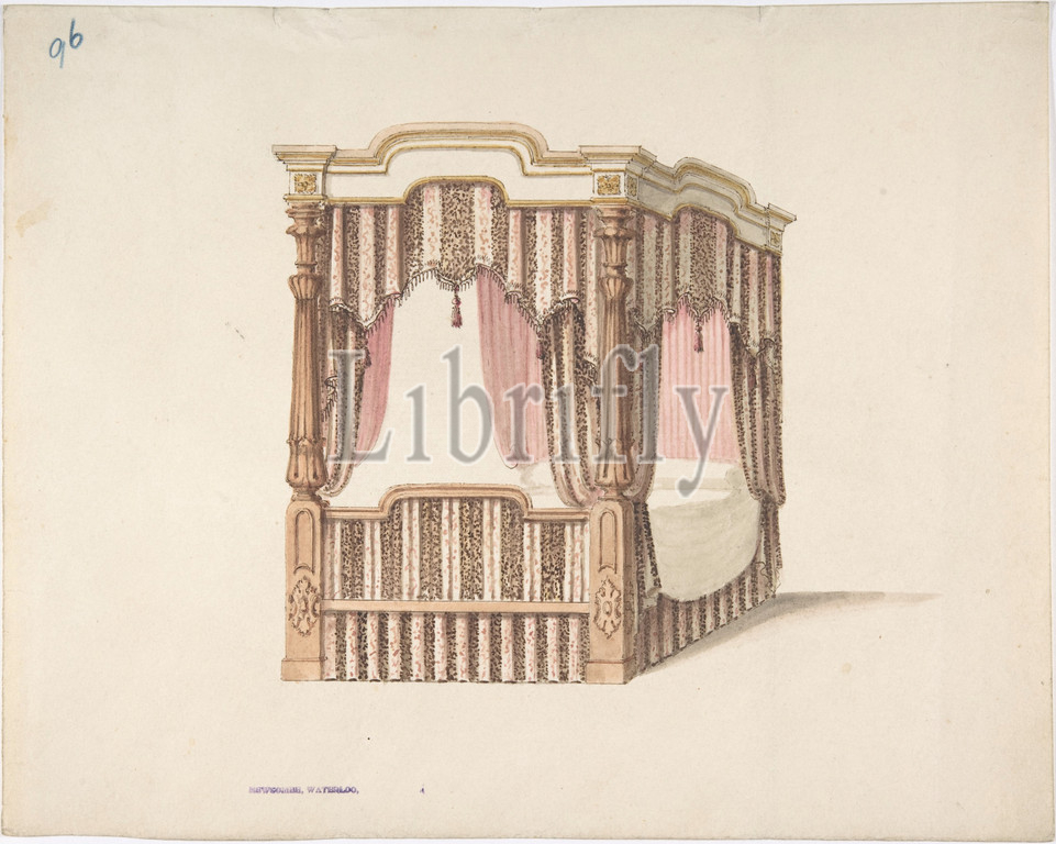 Design, Four-poster Bed, Pink, Brown, White Draperies, early 19th century, Ink, watercolor, wash, sheet, 9 1/2 x 11 7/8, 24.1 30.2 cm, Anonymous, British, 19th