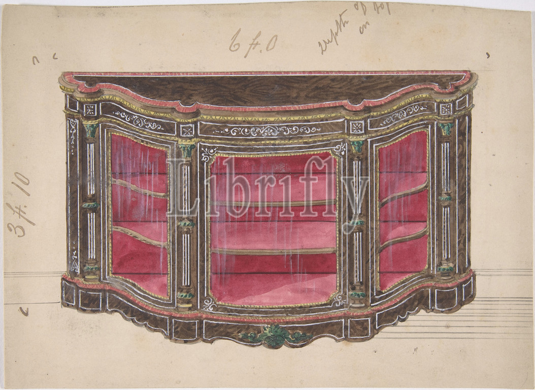 Design, Glass Fronted Cabinet, Red Interior, 19th century, Ink, watercolor, sheet, 6 7/16 x 8 7/8, 16.4 22.5 cm, Anonymous, British