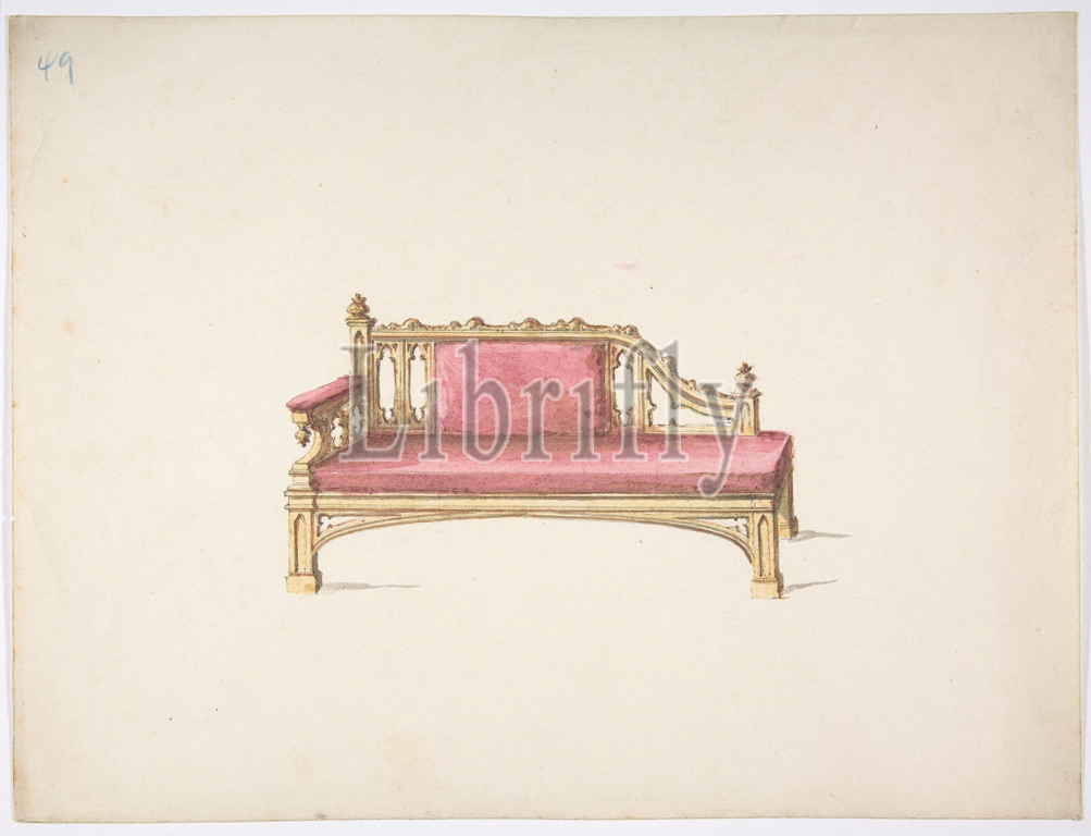 Design, Gothic Style Sofa Upholstered, Red, early 19th century, Ink, watercolor, wash, sheet, 9 x 11 7/8, 22.8 30.2 cm, Anonymous, British, 19th