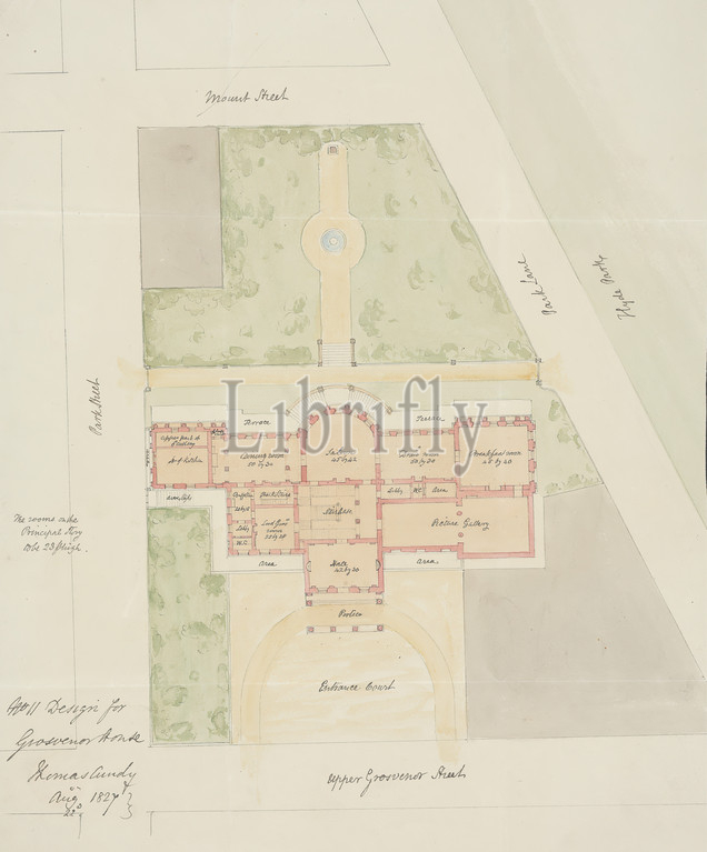 Design, Grosvenor House, London, Plan, Thomas Cundy, 1790–1867, British, 1827, Graphite, pen, black ink, watercolor, slightly textured, moderately thick, cream wove paper, four fold marks, Sheet, architectural subject, design, house, Plan, England, Europe, London, United Kingdom