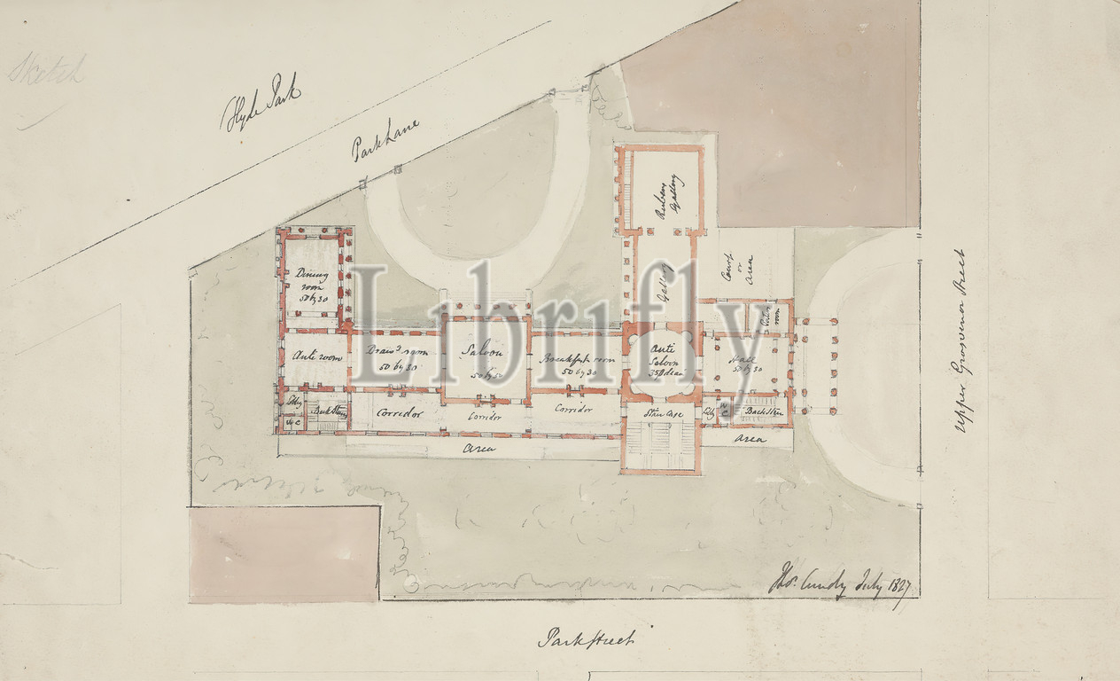 Design, Grosvenor House, London, Plan, Thomas Cundy, 1790–1867, British, 1827, Graphite, pen, black ink, watercolor, slightly textured, moderately thick, white wove paper, Sheet, architectural subject, design, house, Plan, England, Europe, London, United Kingdom