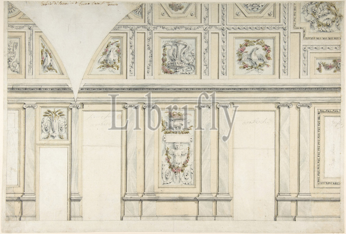 Design, Interior, Gallery, Palace, 1760–97, Pen, black ink, brush, gray, yellow, green, pink watercolor, chalk, leadpoint, ruler, compass constructed, 11-5/8 x 17-5/16, 29.6 44 cm, Drawings, Leonardo Marini, Italian, Piedmontese documented ca., 1730–after, 1797