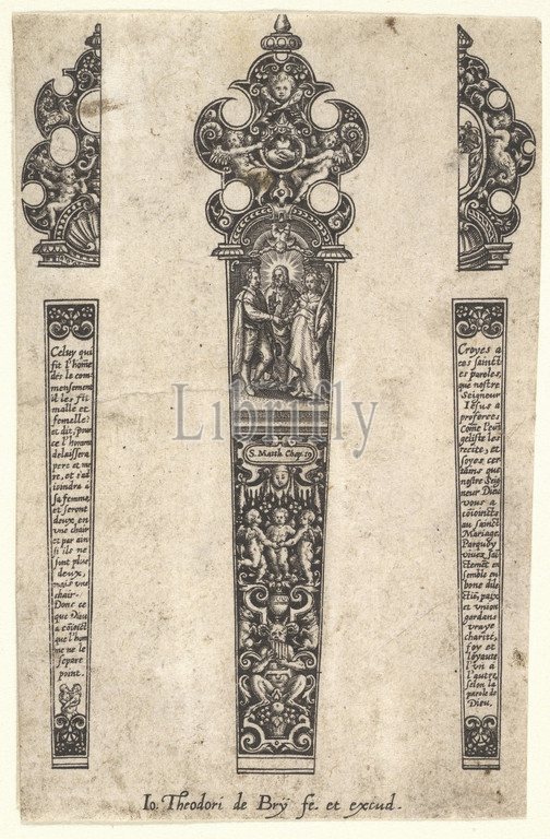 Design for knife handle to commemorate a marriage, ca. 1580–1600, Engraving, sheet: 4 3/16 x 3 1/8 in. (10.6 x 8 cm), Johann Theodor de Bry (Netherlandish, Strasbourg 1561–1623 Bad Schwalbach), After Jan (Pietersz.) Saenredam (Netherlandish, Zaandam ca. 1565–1607 Assendelft), After Hendrick Goltzius (Netherlandish, Mühlbracht 1558–1617 Haarlem)