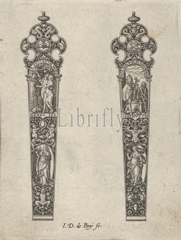 Design for Knife Handles with the Temptation of Adam and Eve and a Memento Mori Scene, 1580–1600, Engraving and blackwork, Sheet: 4 15/16 × 4 in. (12.5 × 10.1 cm), Johann Theodor de Bry (Netherlandish, Strasbourg 1561–1623 Bad Schwalbach), Panel with two knife handle designs, both with scenes under arches at top. The motif at left shows Adam and Eve tempted by the snake, after a design by Heinrich Aldegrever (Bartsch VIII.3). The scene at right shows a man with a rose before the seated figure of Death, shown as a skeleton, and is based on a design by Jan Saenredam after Hendrik Goltzius (Bartsch III
