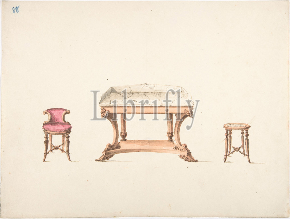 Design, Marble Topped Table, Low-backed Chair, Stool, early 19th century, Ink, watercolor, sheet, 8 15/16 x 11 15/16, 22.7 30.3 cm, Anonymous, British, 19th
