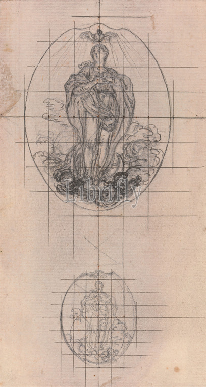 Design, Medal, Figure, Virgin, Hubert-François Gravelot, 1699–1773, French, active, Britain, 1733–45, Graphite, pen, black ink, incised, transfer, medium, slightly textured, beige laid paper mounted, moderately thick, slightly textured, cream laid paper, gold leaf, watercolor, pen, black, red ink, border lines, design, dove, figure, illustration, genre subject, medal