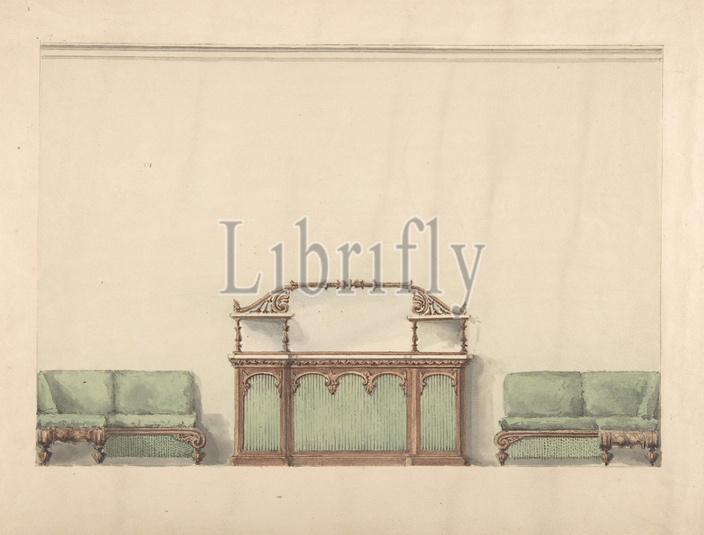 Design, Mirrored, Marble-topped Cabinet, Two Sofas, early 19th century, Ink, watercolor, wash, sheet, 12 3/16 x 17 1/8, 31 43.5 cm, Anonymous, British, 19th