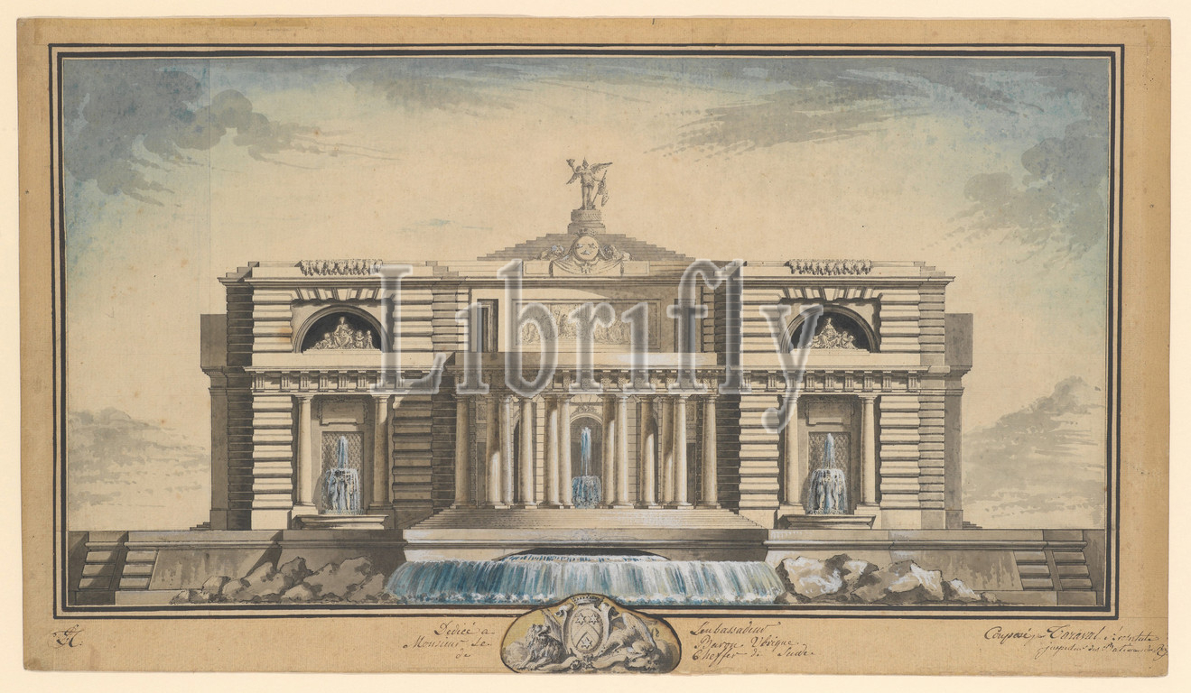 Design, Neoclassical Building, Thought, School, Arts, City, Stockholm, ca, 1770–94, Pen, gray ink, brush, brown, gray, colored wash, heightened, white, framing lines, pen, brown, paper strips framing, drawing sheet, 10 15/16 x 20 11/16, 27.8 52.6 cm, Louis Gustave Taraval, French, 1738–1794, Paris