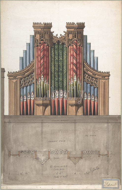 Design, Organ Case, Saint Saviour, Church, Chelsea, London, 1890, Pen, ink, wash, watercolor, gouache, graphite, Ernest Geldart, British, 1848–1929